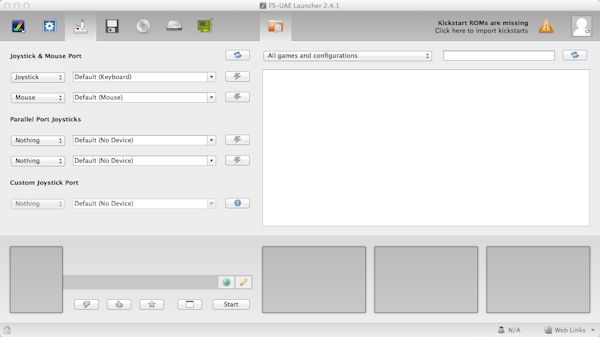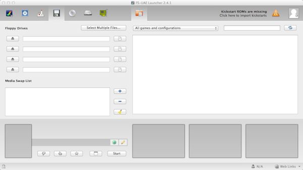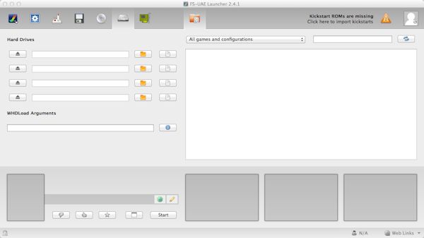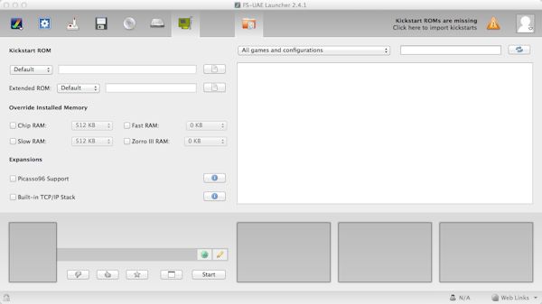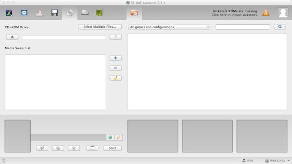 a) First you will need to import the kickstart rom files. Copy the ROM files to your documents or where-ever and click on the icon saying that says 'Click to import Kickstart ROMs'.