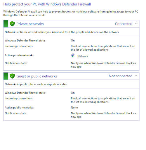 Clicking on Firewall and Network Protection displays current firewall settings.
